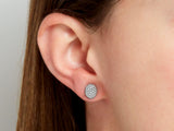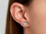 These eye-catching pave oval diamond stud earrings are in platinum.  We decided to do them in platinum for those who want to match their platinum wedding rings or for those who would like to have "something different".  They are set with beautiful, sparkling white diamonds and sit on the ear perfectly.  The model wears these versatile studs two ways, one photo shows them lengthways up and down and the other photo shows them sitting sideways.  The oval shape is rounded on top (not a flat oval).  The stud earring has an 18K butterfly back or what is known as the classic push-back clasp to make them very secure.  They are perfect for everyday wear and also for fancy nights.  These earrings are only available in platinum.  Engraved on the side of each stud is PT for precious Platinum and RFG for Rhonda Faber Green Designs.