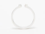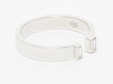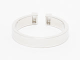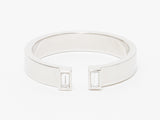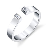This great ring has two baguettes at the top with an opening between them. This open band ring can be worn alone for a delicate, understated look or added in a stack with other favorites. Baguette diamonds beautifully compliment the luxurious 18k white gold. The diamonds are bezel set.