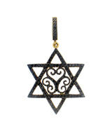 A stunning all black diamond Star of David pendant with a center filigree design. The center is accented with scrolling heart motifs pavé-set with black diamonds and attached to a hinged pavé-set black diamond bail in 18k white gold. Perfect size to wear everyday. Please see the white gold Star of David on the model for the size of this pendant.