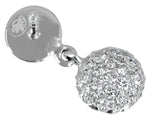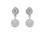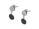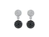 A beautiful pair of pavé-set dangling diamond dot earrings, the top dot set with white diamonds suspending a larger dot with black diamonds on the front with white diamond on the back, all in 18k white gold.