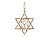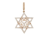 A pretty, stylized, diamond Star of David pendant.   The center is accented with scrolling motifs pavé-set with diamonds and attached to a hinged pavé-set diamond bail in 18k rose gold.
