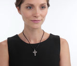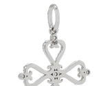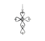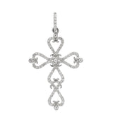 Filigree openwork with a heart motif accents this beautiful cross. It is set with an outline of diamonds, the center and cardinal points accented with larger bezel-set diamonds. The bail also has diamonds set in it.